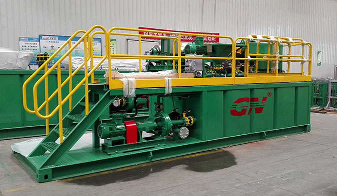 本套系統(tǒng)分為2個(gè)階段的固控處理和一套泥漿配置混合系統(tǒng)。鉆井泥漿初步分離采用的是冠能GNZS752型振動(dòng)篩,200GPM的處理能力、兩片篩網(wǎng)的構(gòu)造用來處理鉆井泥漿中的大顆粒的固體。振動(dòng)篩處理后的液體通過離心泵輸送給迷你型的沉降離心機(jī)GNLW223進(jìn)一步處理,可達(dá)3800RPM的轉(zhuǎn)速,分離的固體顆??蛇_(dá)到2個(gè)微米。