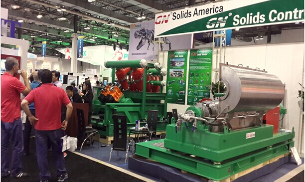 本次我公司參展的是一臺處理量達(dá)240立方米/小時(1056GPM )的泥漿清潔器和一臺GNLW553 - VFD是鉆井液離心機(jī)。GNLW553 – VFD離心機(jī)是一臺大體積大處理量的離心機(jī),具有專門的變頻器和PLC控制系統(tǒng)進(jìn)行快速處理操作。
